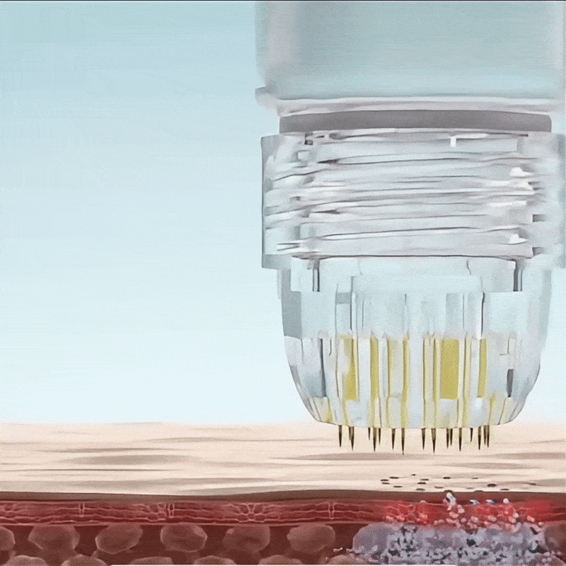 At the core of our system is the 0.5mm gold-plated microneedles, designed to gently create hundreds of tiny, painless channels across the scalp.